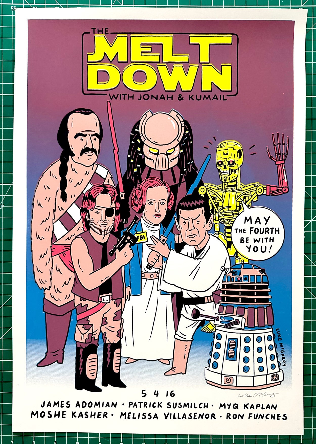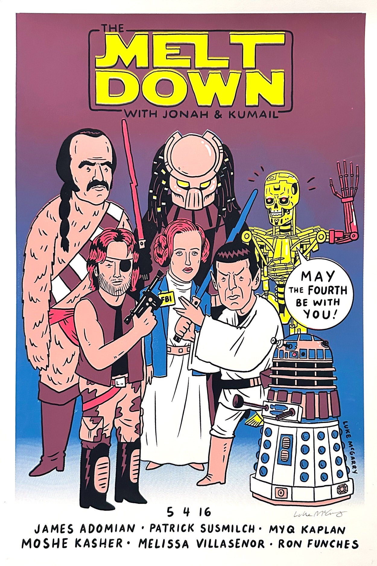 Guest commissioned poster for the legendary (but sadly defunct) Meltdown comedy shows with Jonah Ray and Kumail Nanjiani in the back of LA's Meltown Comics.